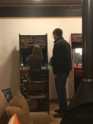 I set up a kids table with footballs and kid crafts. It was so funny because all the little girls went outside and were throwing the football around. The boys wanted to play in the house, watch the game and play our Pac-Man machine. The best part was it wasn't really working they just thought they were playing it. Greg got it working eventually but they had more fun I think just pushing the buttons!!